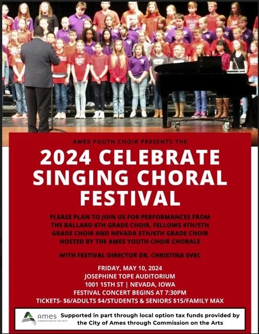 The Celebrate Singing Choral Festival (CSCF) was created by the Ames Children’s Choirs (ACC) program in 2008. The host choir is ACC's Chorale. Throughout the years, CSCF has provided the opportunity for school and community choirs to hear and perform with other choirs. This festival developed as an outgrowth of the ACC sponsored Midwest Children’s Choir Festival (MCCF), which includes select singers from children’s choirs throughout the state of Iowa. Music teachers who have participated in MCCF expressed an interest in having an opportunity for their entire choir to participate in a festival experience.